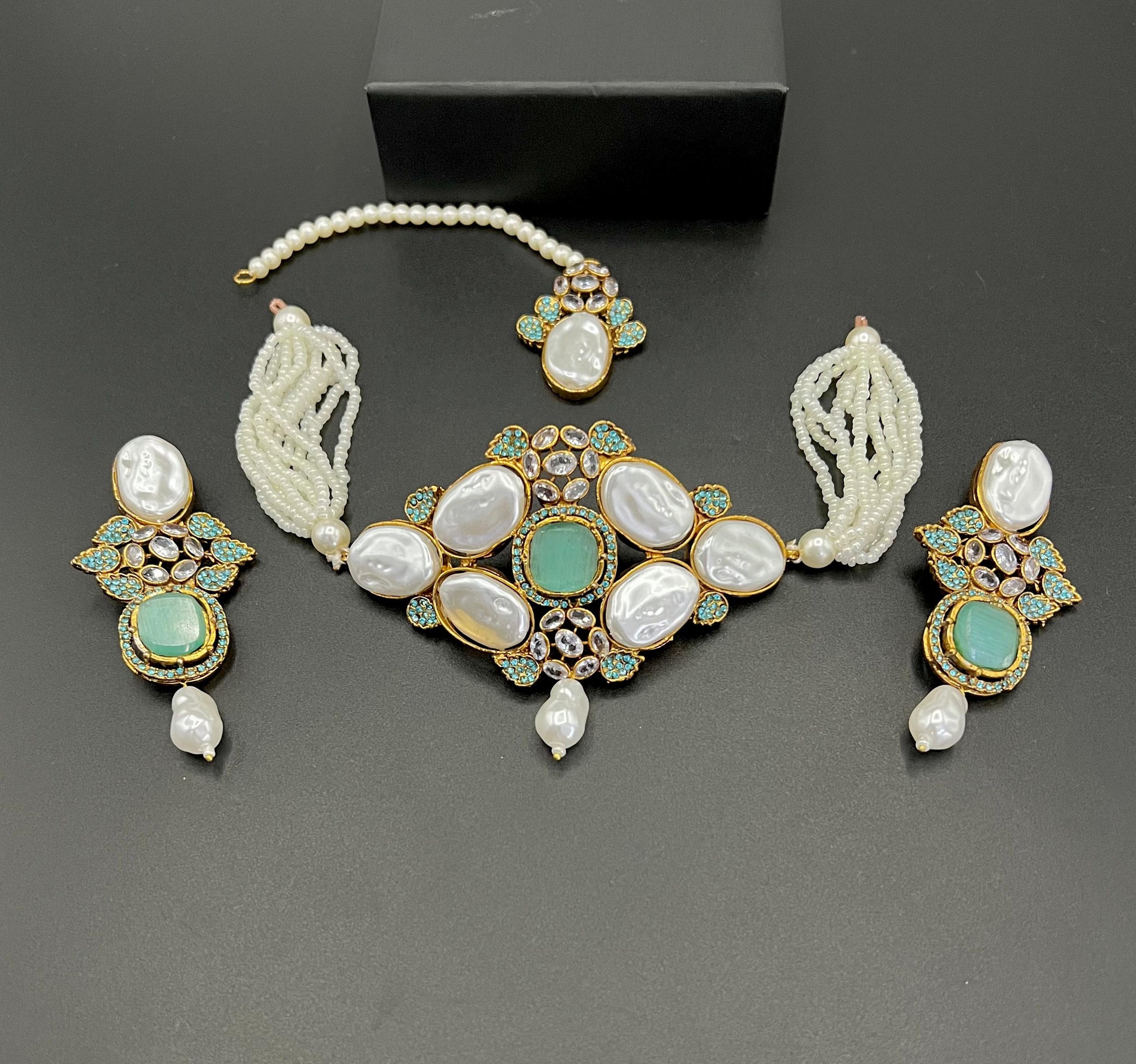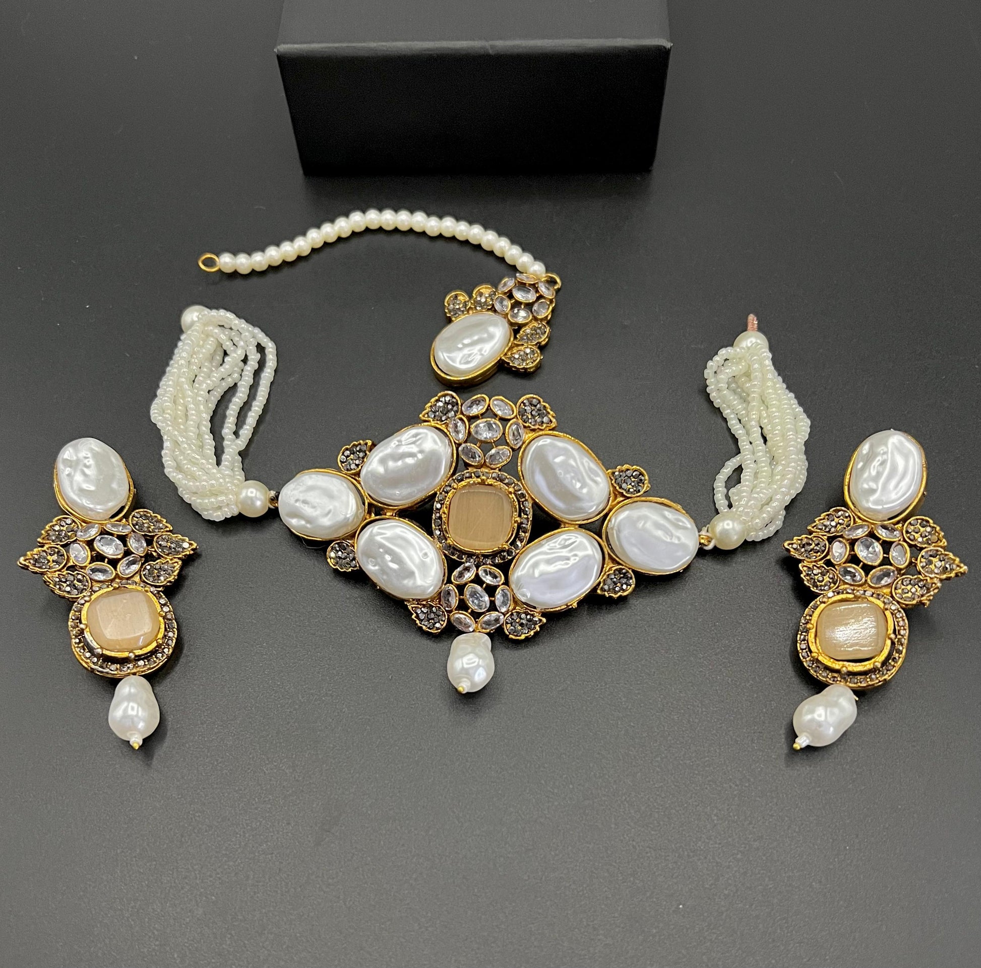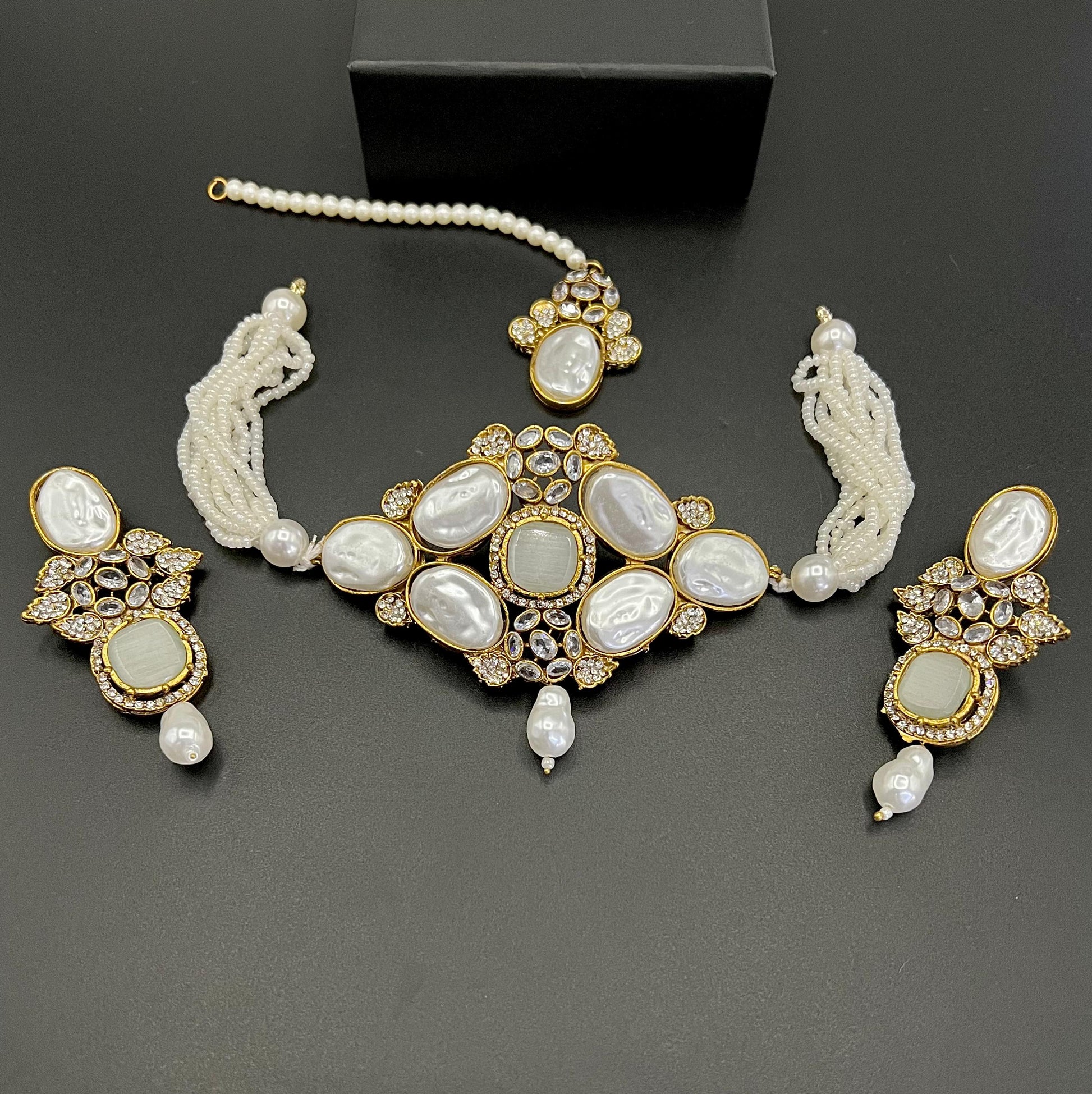 Turn heads with this Regal Pearl & Kundan Choker Set, a luxurious blend of classic elegance and modern grandeur. Featuring a richly detailed choker adorned with white baroque pearls, gold-toned kundan stones, and shimmering crystal accents, this set exudes royal charm. Paired with matching statement earrings, it's the perfect ensemble for weddings, festive occasions, or grand celebrations.