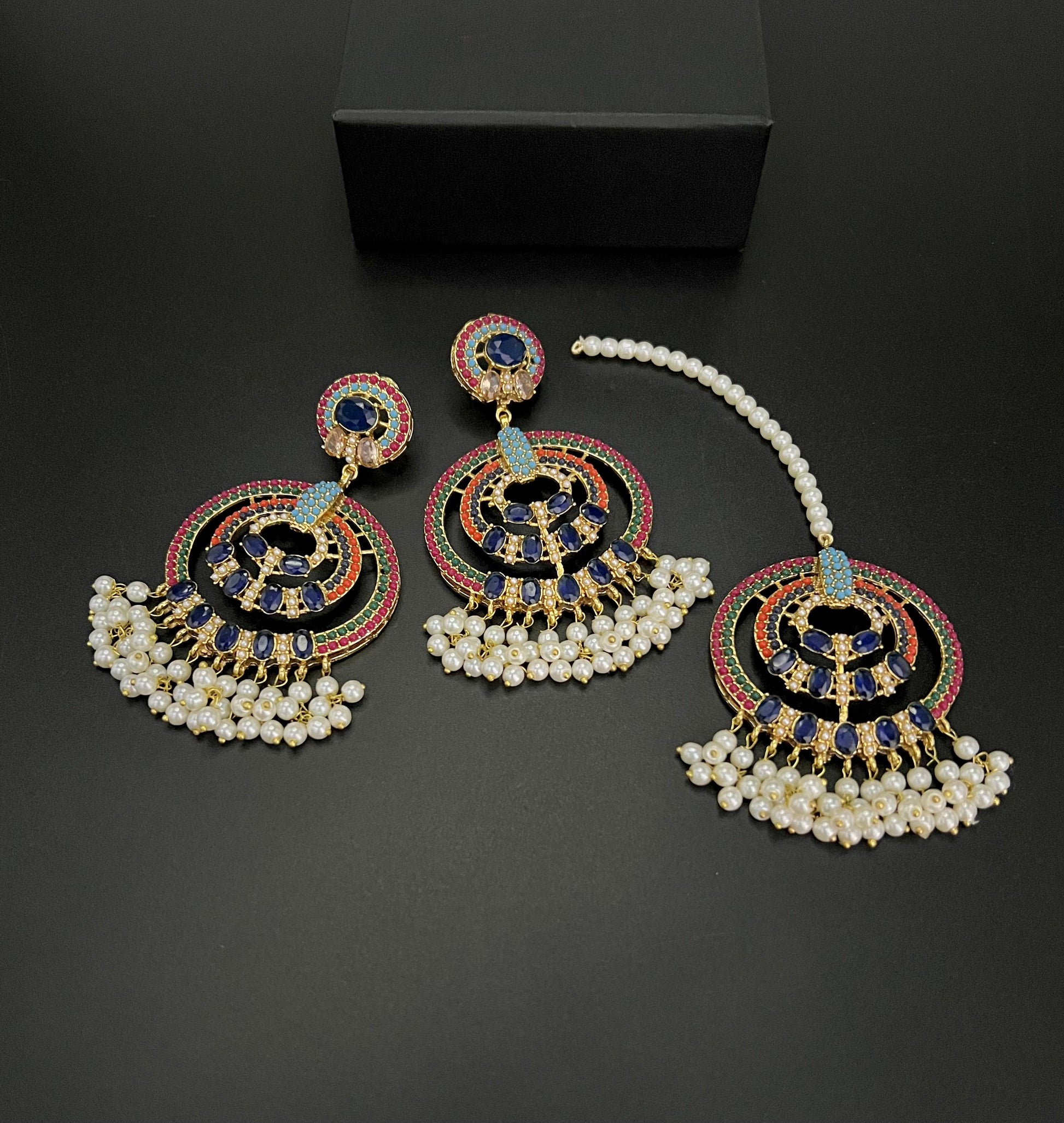 This exquisite jewelry set features a pair of statement earrings with matching tikka, beautifully designed with layered multi-color stones, golden finish, and pearl bead hangings. Perfect for weddings, mehndi, baraat, and festive occasions to complete your ethnic look.